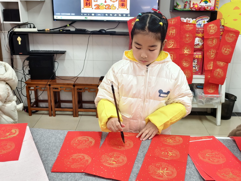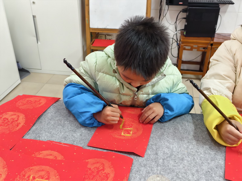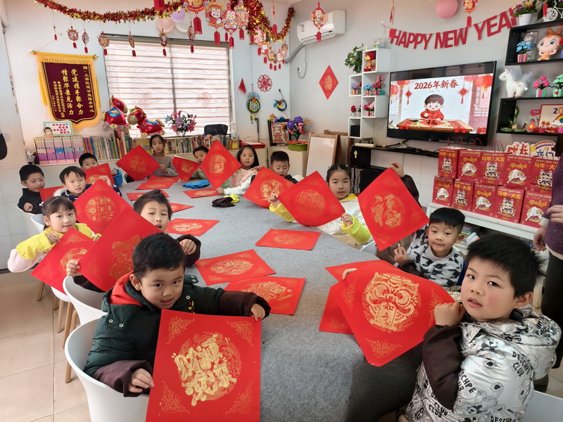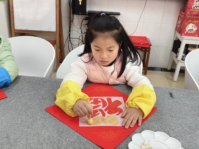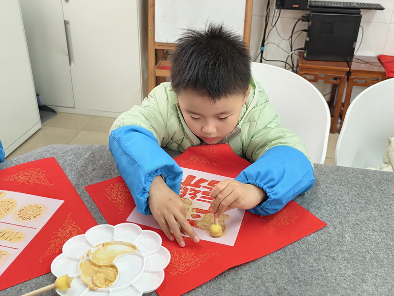 袖套戴好,海绵刷蘸满金彩!在老师带领下,孩子们专注地在红纸上拓印出一个个独具特色的“福”字。模板虽同,每一幅却都是独一无二的童年祝福。