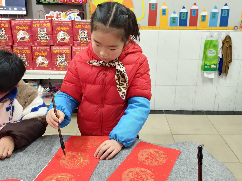 握笔、临摹、书写……孩子们认真地在红纸上落下稚嫩却真诚的笔迹:“吉祥如意好运来,平安喜乐福气到”“平安喜乐福星到,马年大吉好运来”……横批更是童趣满满,寓意深深。